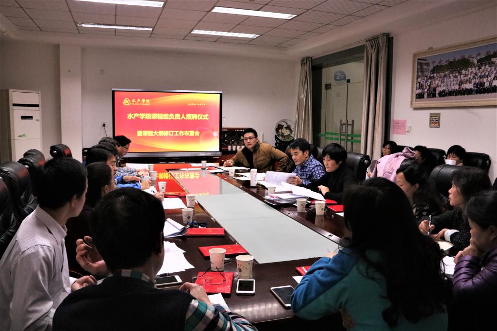 (通讯员 赵峰)11月28日下午,水产学院课程组负责人受聘仪式暨课程大纲修订工作布置会于水产楼209举行。水产学院党委书记张韶东、华中农业大学教务处教研科科长谢书山、水产学院本科教学督导员罗宇良、系主任及各课程组负责人出席了本次会议。会议由副院长黄丹主持。